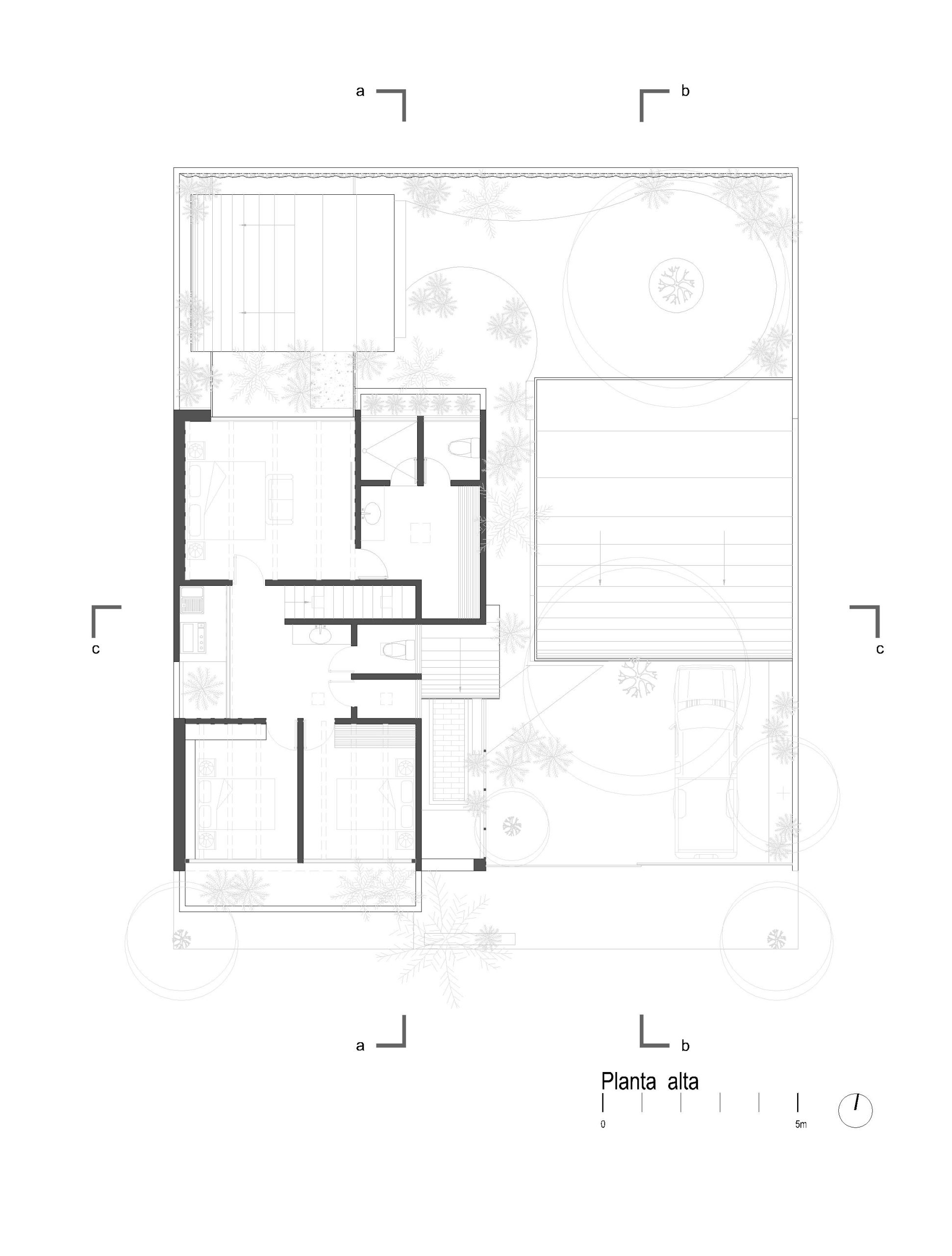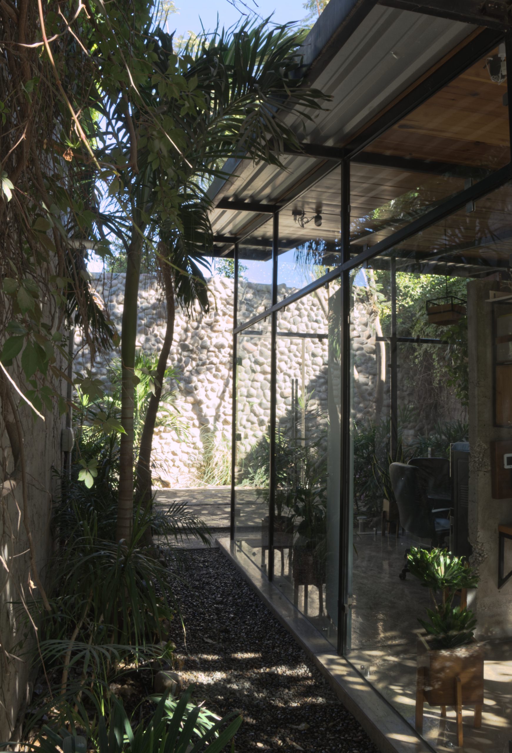 La Casa-Estudio Helechos fue diseñada como un jardín donde la arquitectura aprovecha la orientación sur para proteger la privacidad de los espacios y regular la incidencia solar, manteniendo su fachada cerrada al exterior confinando una jardín habitable y protagonista. La vegetación es tomada como el acabado final en todas las superficies y habitaciones aprovechando sus atributos climáticos que genera.