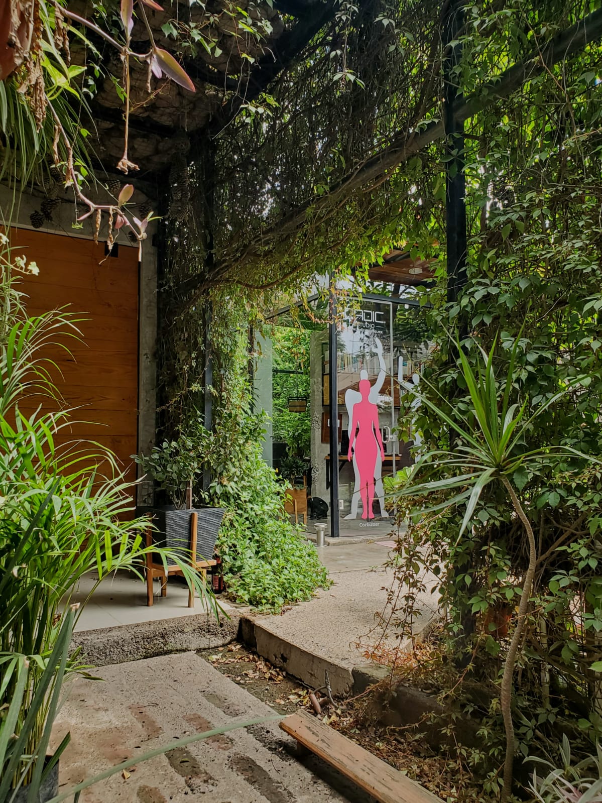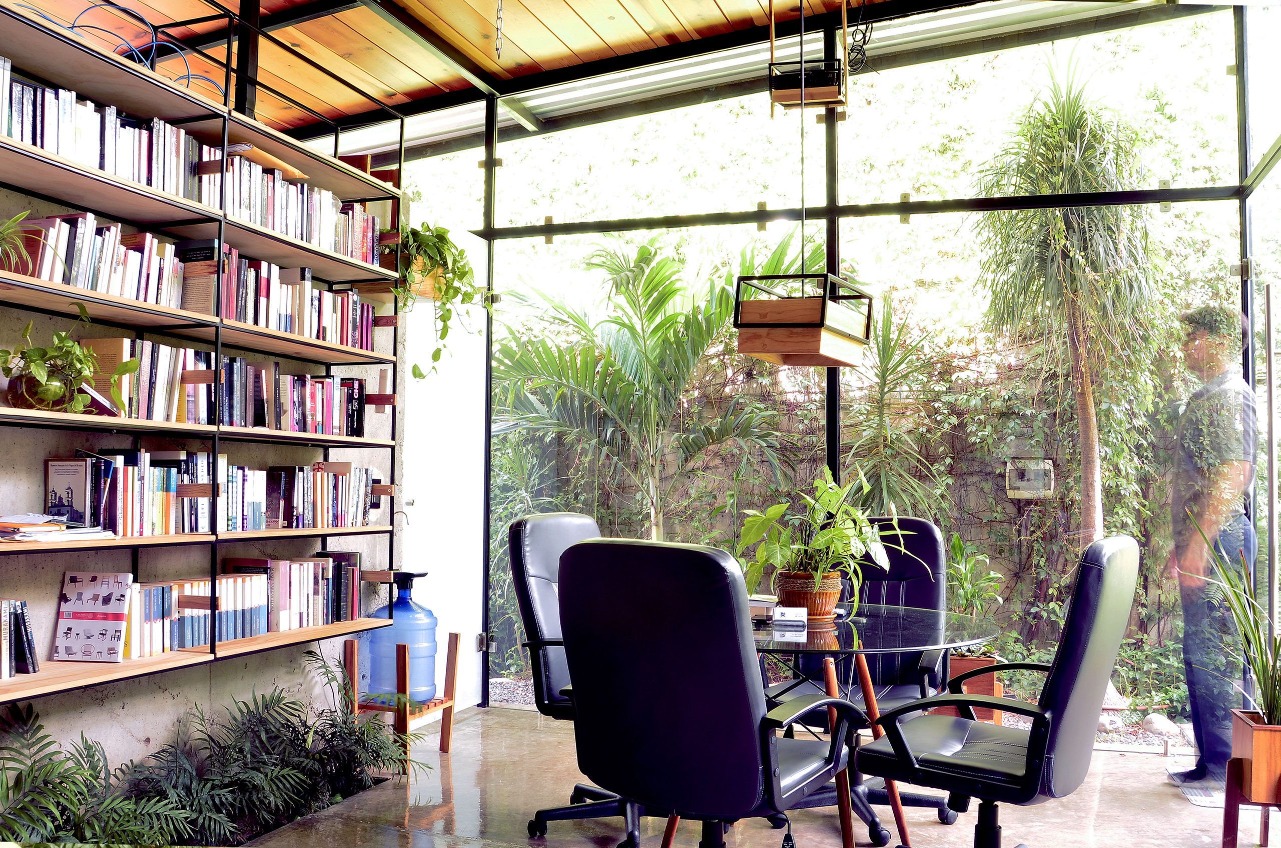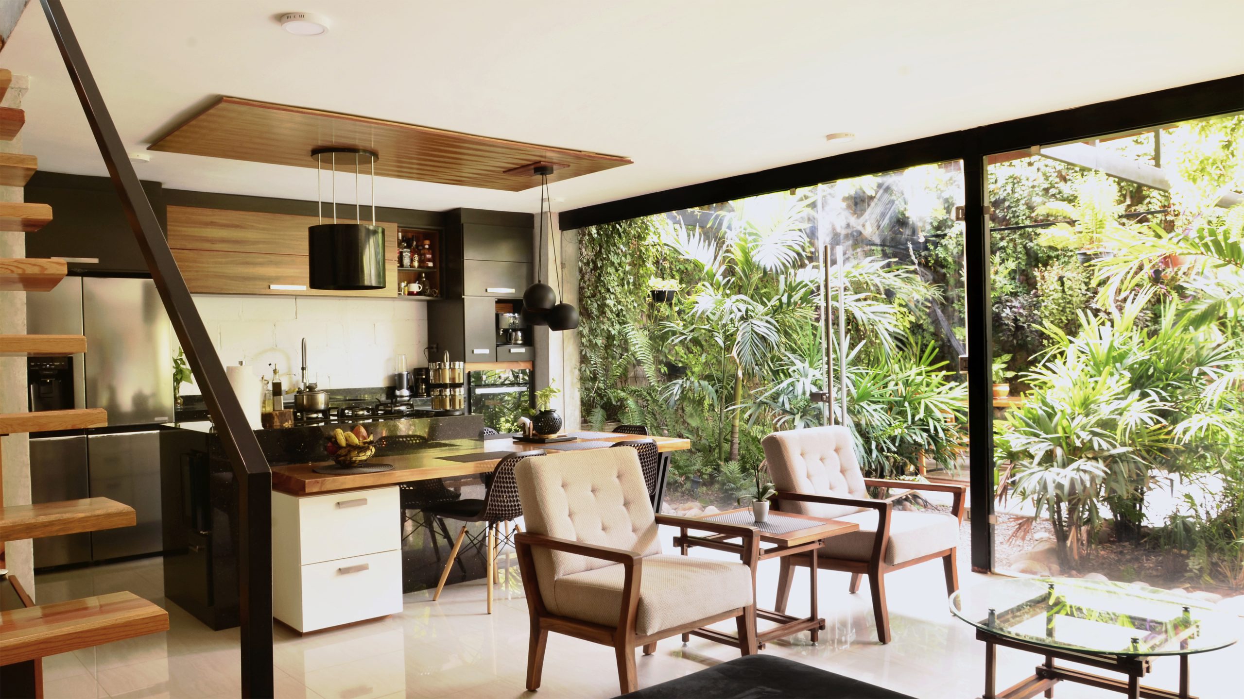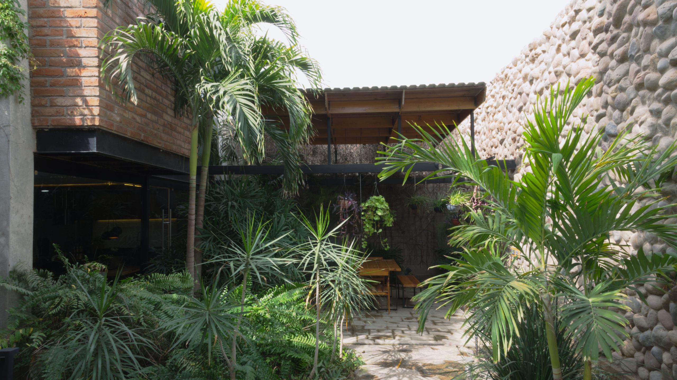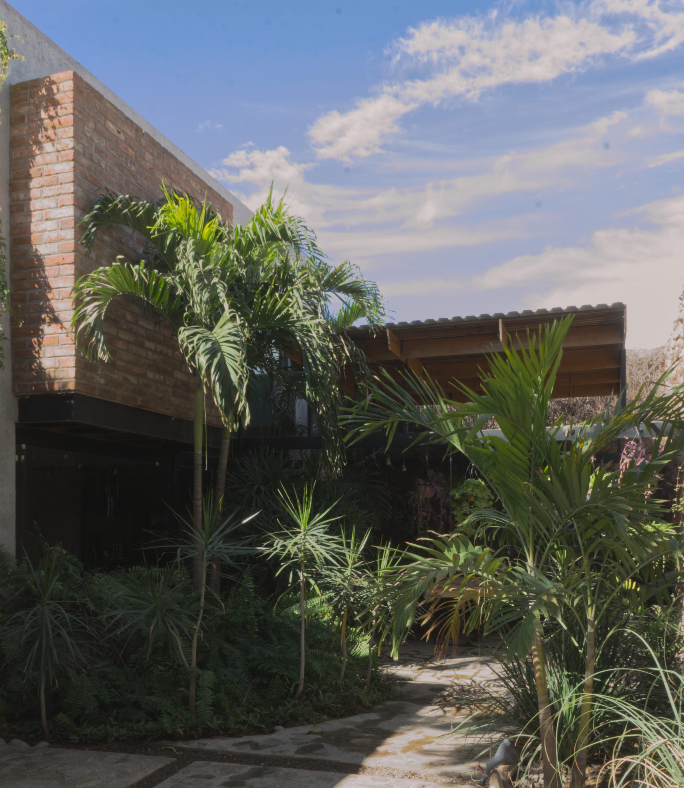 Desde el interior, cada espacio se conecta a los jardines que filtran la luz natural y generan un ambiente iluminado y fresco. Para el estudio, una Amapa morada enmarca el ingreso al espacio, mientras una jacaranda define el remate visual posterior.